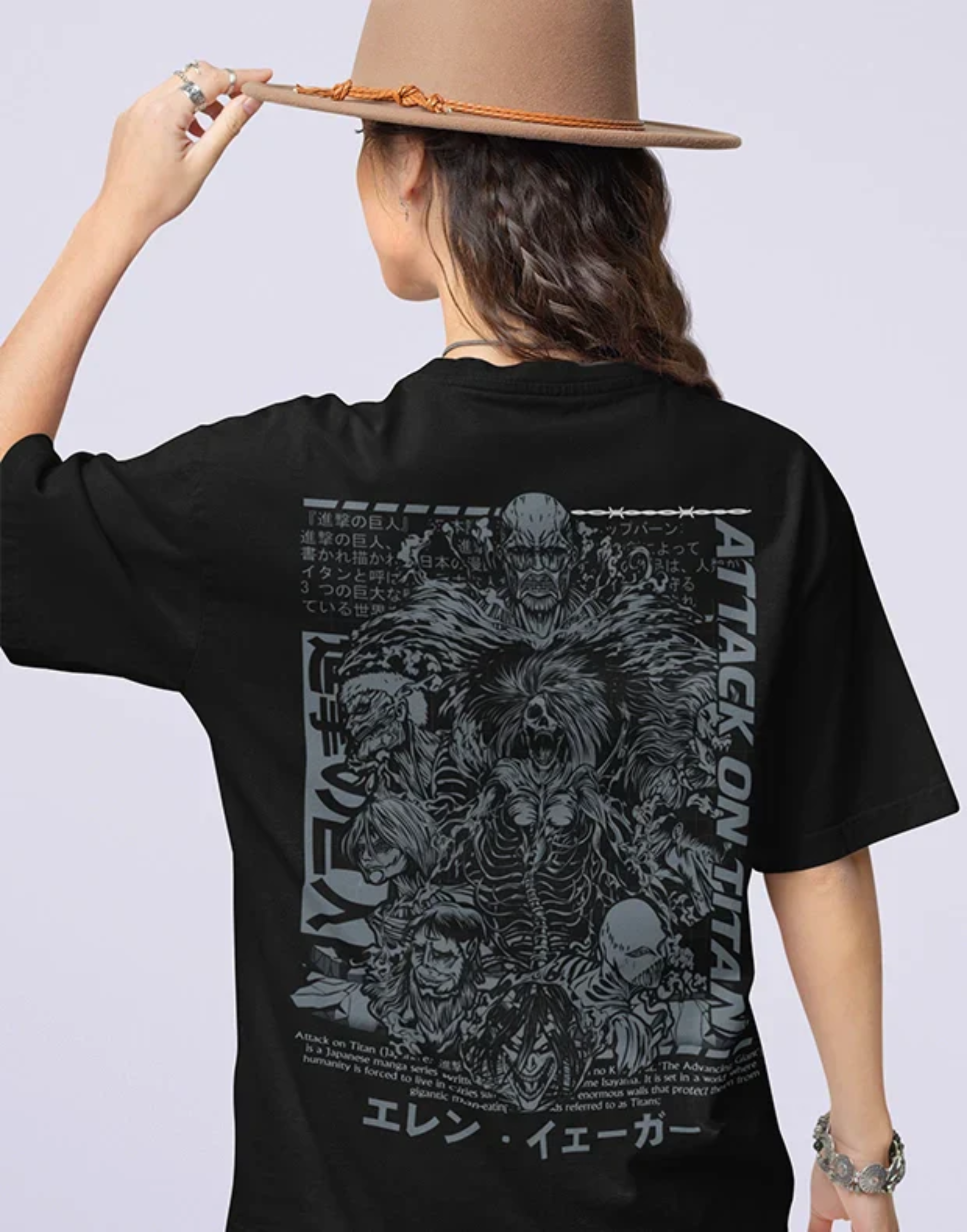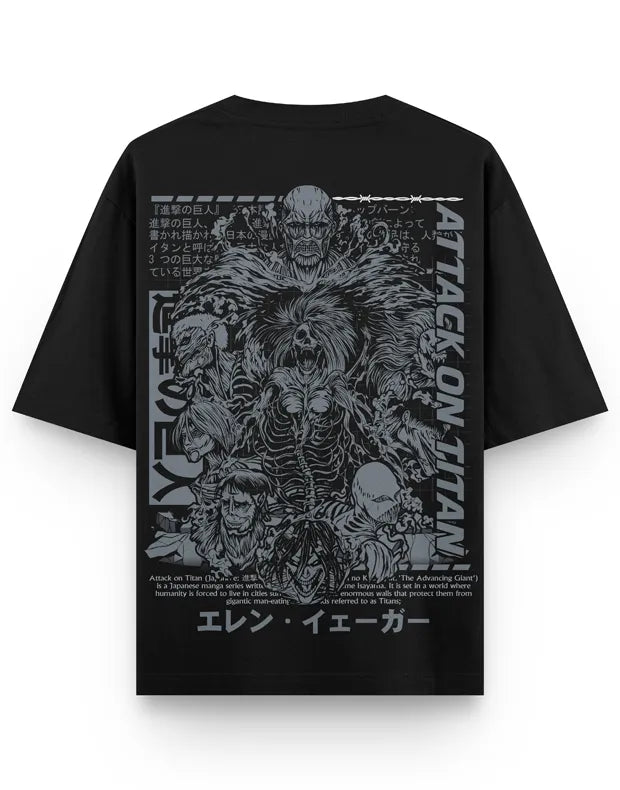 Colossal Drip: Nine Titans Attack on Titan Anime Oversized T-Shirt! Become a walking wall (of awesome) with this trending tee. Represent the power of the Titans in ultimate comfort.