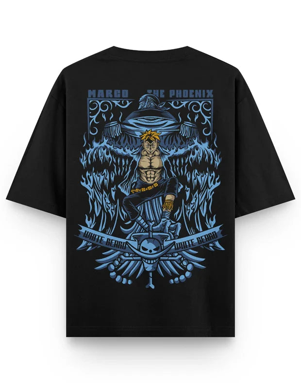 Stay Cool Under Pressure with the One Piece Marco Anime Oversized T-Shirt! This comfy oversized tee features the ever-calm Marco, the Whitebeard Pirate who can both fight and heal in a relaxed way.